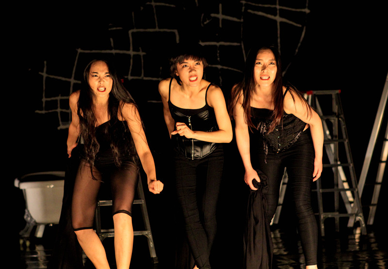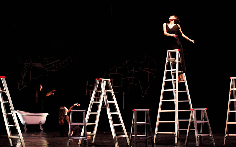 舞台上发生的一切,无一不诉说着精神折磨的无奈与痛苦。三位黑衣女子的尖叫声,七零八落的台词,抽搐的肢体,忽明忽暗的灯光,舞台上的梯子和浴缸自由的由她们支配着。全剧没有什么结构,连这种没有结构的结构也是在向观众诉说着苦楚——精神崩溃。