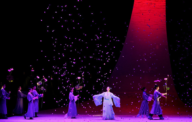 剧中适当地加入并揉合了古今中外的元素,如地方小戏、百老汇元素、多媒体特效,使这出戏更加具有魅力。简洁的舞美犹如水墨画般映入观众的眼帘,加上恰到好处的灯光、小河流水的音乐,更是如同进入人间仙境那般令人心醉。无论是从演员脸上勾勒的线条还是身上的穿着,都可以显而易见地看出中国式的美。尤其在众演员一同舞动的时候产生的线条,勾人心魄。从天而降的粉红花瓣从直观感受上带我们进入了如梦如幻的世外桃源。