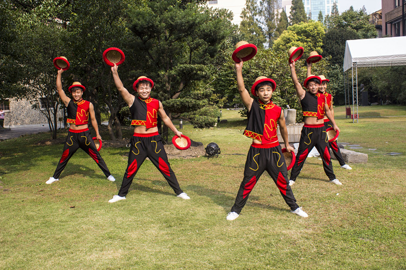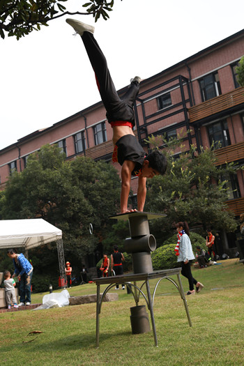 10月21日是上海国际艺术节扶持青年艺术家创想周活动的第三天。这一天的天气远远比前两天好很多,少了前两天的冷风和雨滴,气氛格外欢愉。就在红楼后面的草坪上,一群青年杂技魔术艺术家登场了。他们身穿红底烫金绣边的无袖表演服,集体展现了一场精彩绝伦的动作表演。