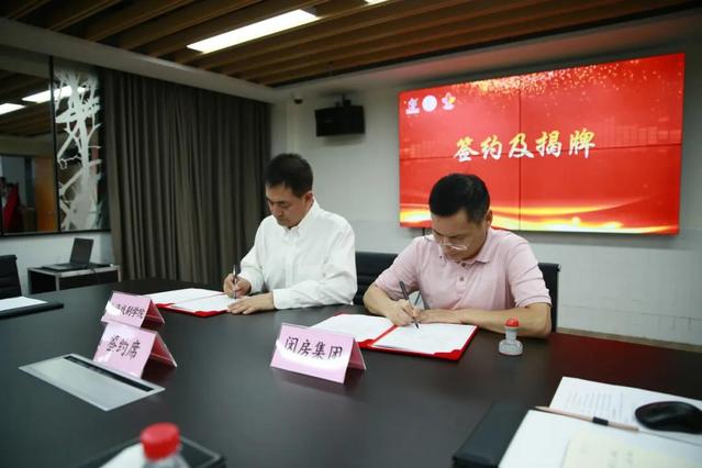 上海戏剧学院党院办副主任、电影电视学院党支部书记韩永胜与闵房集团党委书记、董事长阳勇建签订合作协议。