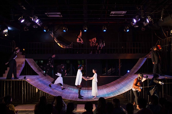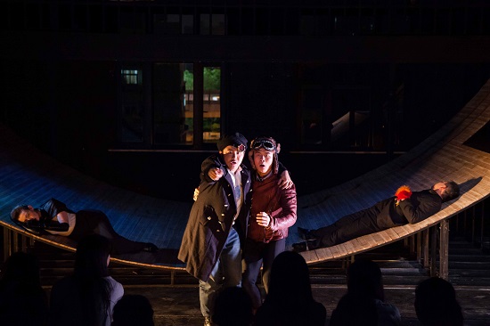 本剧的表演融入了很多的元素,如魔术,戏曲,表演形式上也非常的多样化,使现场观众惊喜连连,笑声不断。舞台的U型坡道也为表演提供了独特的平台,使其可以象征现实中的暴风雨起伏也可以暗示人物心中的情感变化,坡道两边的高台和二楼的运用,将场景的转换,主次关系处理得十分恰当。但是由于各种元素的运用和丰富的演员角色,戏中每一个单独的人物拿出来都个性分明,但结合在一起使整部戏的整体感缺乏,有种局部大于整体的感觉。在人物塑造方面也略显薄落没有将普洛斯彼罗内心的转变表达到位,将人物心灵深处酝酿的暴风雨挖掘出来,转折的略显突兀。精灵爱丽儿的表演十分精彩,其中一个是中国传统戏曲的装扮,另一个是充满异域风情的印度女郎,他们将整个故事以各自的特色串联起来,从一开始被束缚,到后来被予以自由后,又不愿离开主人的心情不落于语言,仅通过肢体的表达和印度风味的吟唱展现出来,令人眼前一亮。无论从形式上、关系上还是人格上都拿捏恰当。