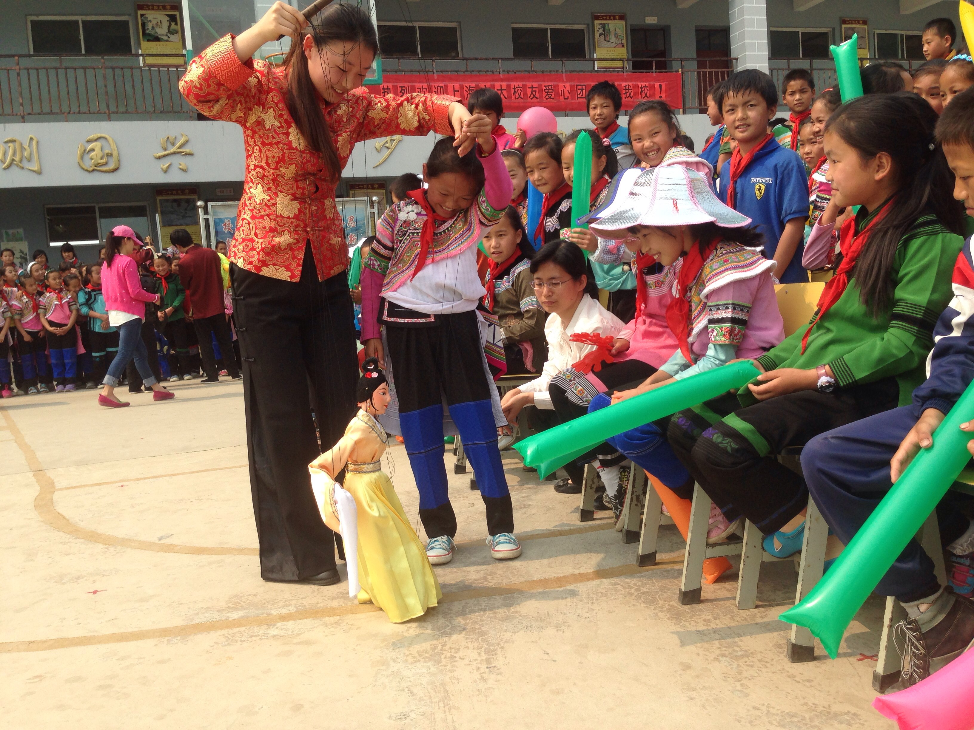 图为上戏学生带来的木偶表演引起了当地小学生的极大兴趣