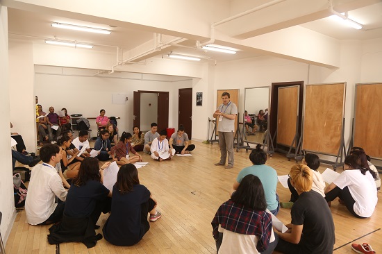 这是来自东瀛的日本友人和他们的德国导师皮特•格斯那主讲的工作坊,内容主要是古希腊悲剧《安提戈涅》的片段表演练习。聆听的学生主要来自三个国家,菲律宾、韩国和日本。导师先做了自我介绍,并分发了剧本的大纲,中英对照的版本。简单解释了下意图后,学生便四散开来,揣摩研究剧情,模仿实践动作。十分钟后,不同国家的学生被两两分组,要求面对面进行合作表演。虽然只是初次相识,短短几分钟的内心体会,并没有排练试镜。大家的表演非常的赞,爆发力表现力惊人。台词眼神到位,肢体语言丰富生动。