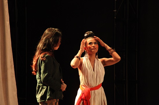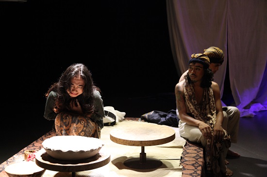 电视机里的三人组,出来骚扰妻子,也惊讶于她的保守无知,嘲笑着她的迂腐木讷。“everyone has TV in bedroom,it has the things from all the world,it look at everyone like i looking at you now”原住民趁机表演了他们的拿手绝活——美式的嘻哈街舞、朋克饶舌,也暗指西方文化对传统的侵蚀和替代。舞女在一边拍手叫好,大呼过瘾。妻子迷惘了,不知道该不该相信眼前三个奇葩怪物的话,也对丈夫的行为心灰意冷。原住民不由分说拉妻子进入他们口中的世外桃源,双臂包围,死缠烂打,妻子害怕恐惧,不情愿却无可奈何,在一声尖叫中疯狂逃出了屏幕。回家却一眼撞见舞女和丈夫在偷欢享乐,耳鬓厮磨。妻子直勾勾地看着,眼睛里满是怨恨哀愁,也只能走向一直属于她的领域,继续抓起粘土,烧起陶器,看着圆台周而复始,和她每天的生活一样,在漫无边际的等待顺从中沉入大海。丈夫最看不惯的事儿上演了,觉得妻子太迂腐不懂世故,简直是死板的老古董。一巴掌上脸,也宣告了两人爱情的决裂。心碎的妻子以泪洗面,痛苦哀嚎,脸上的泪水和粘土混在一起,阴郁严肃的将人们拉回残忍的现实。丈夫觉得可以和舞女在一起了,满心欢喜。可是舞女愧疚心软了,觉得打扰人家正常生活感情很不道德,让一个日日思念夫君的贤妻落得如此悲催邋遢。丈夫的跪地请求被舞女狠心拒绝,只得愤慨而去。在丈夫悲壮的歌声中,tv三人组沉默了,他心痛地指着屏幕,臣服在妻子脚下,希望用白布掩盖这不堪回首的过去。