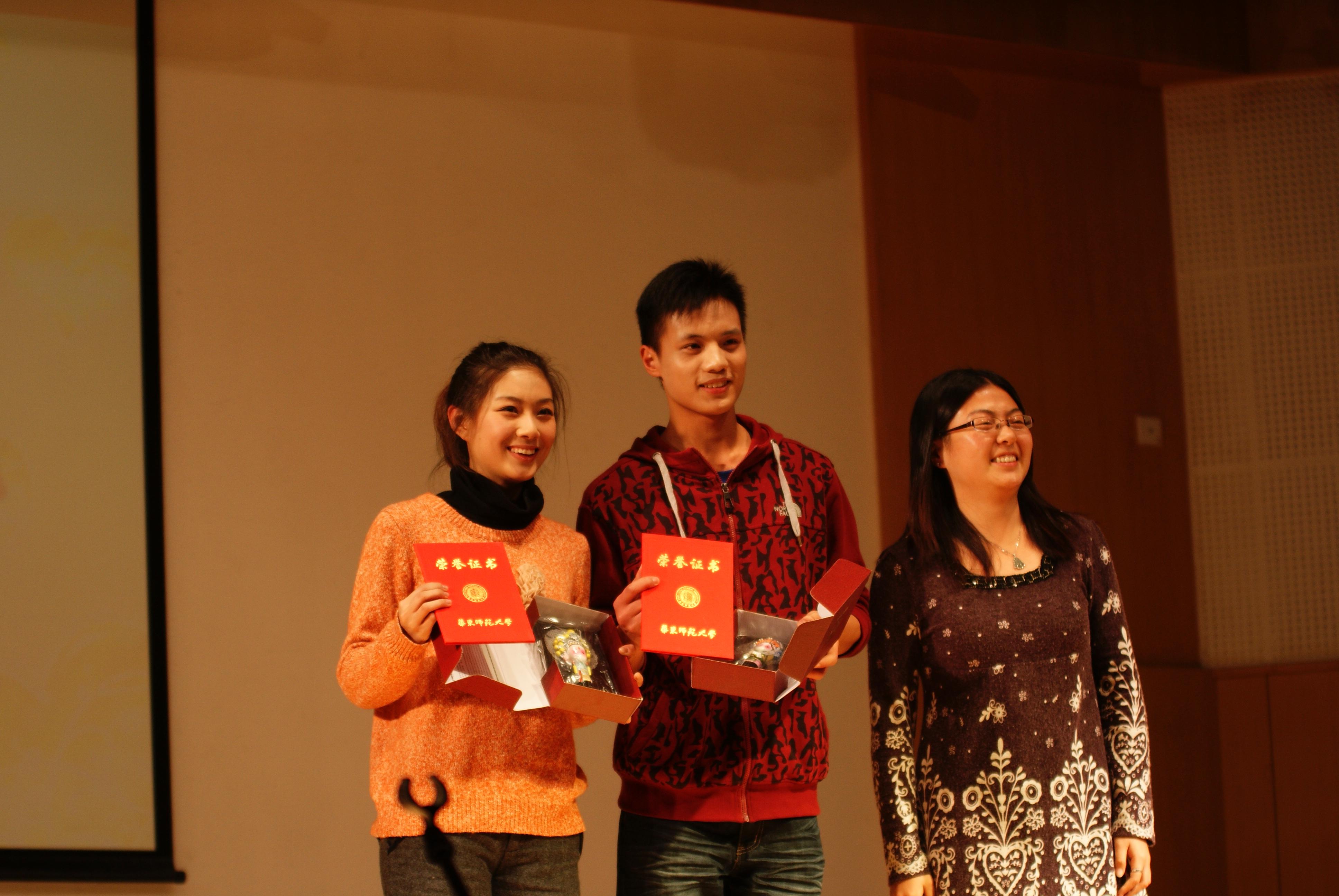 图为郑雪菲同学(左一)获得最佳女演员奖
