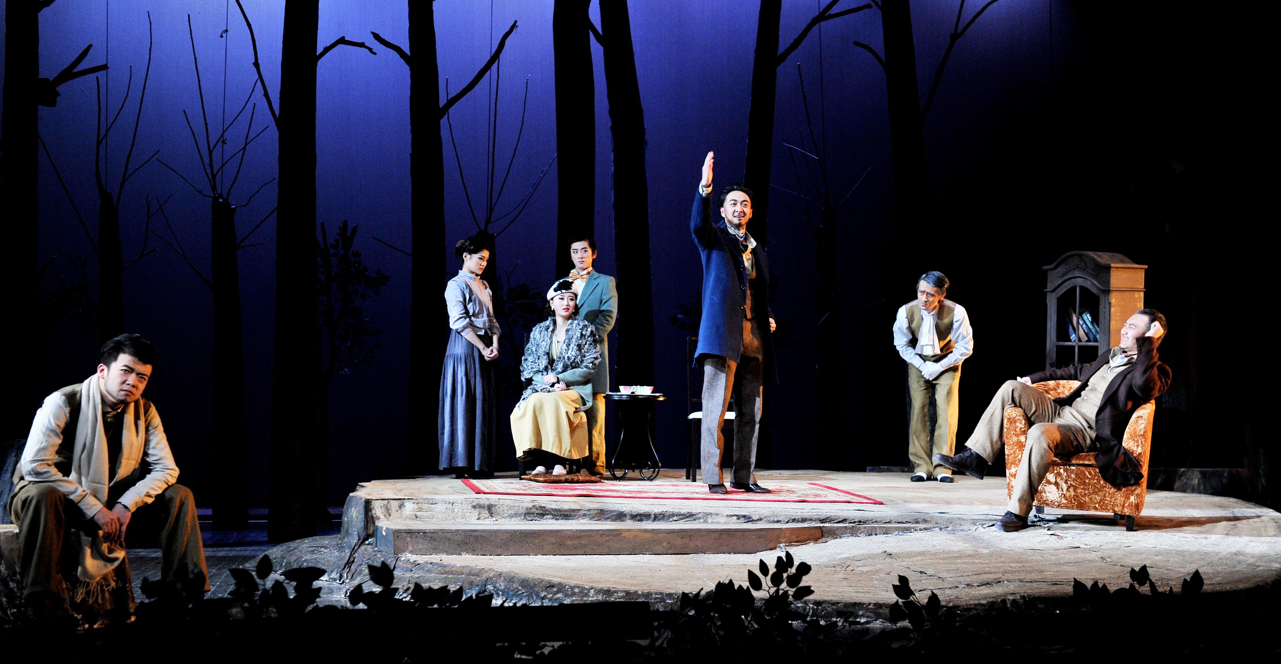 整台话剧在一个巨大的树桩上上演,使《樱桃园》给人带来更多的遐想空间。然而演员塑造出的生动戏剧人物、真狗中秋的出场以及逼真的园林布景都将观众拉回现实主义的世界。戏剧结尾,通过光影的变换,营造出樱桃园的四季与兴衰。