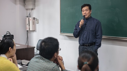讲座开始前半个小时,红楼209教室已经水泄不通。由于慕名前来的老师、同学、文学爱好者人数过多,原有的座位远远不够,大家自发地搬来座椅,四五个人挤在同一张课桌前,人头攒动却尽然有序。下午两点整,赵丽宏老师步入了209教室,他着藏蓝第白条纹衬衫,配一条黑西裤,平易近人。负责开场引言的老师洋洋洒洒地念出他取得的头衔和荣誉,赵丽宏老师低头静静听着,仿佛在听别人的故事,当他拿到话筒后,只是告诉大家“这些内容并不都详实,听听罢了”。大家笑了。负责人请赵丽宏老师入座,他不肯坐下,因为“坐下后面的同学就看不见我了”,这么一站就是两个小时,而他已过花甲。