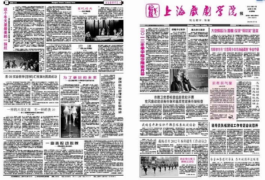 《上海戏剧学院报》2012年第1期(总第231期)已于2012年1月5日出版,本期套红,共四版,重点内容有:《2012冬季学院今隆重开幕》、《大型舞蹈诗<四季>荣获“荷花奖”金奖》、《戏校学生在“全国青少年戏曲邀请赛”争金夺银》、《市教卫党委检查组赴我校开展党风廉政责任制和基层党建责任制检查》等,敬请关注。也可点击下载观看。(图文、编辑/榕树)