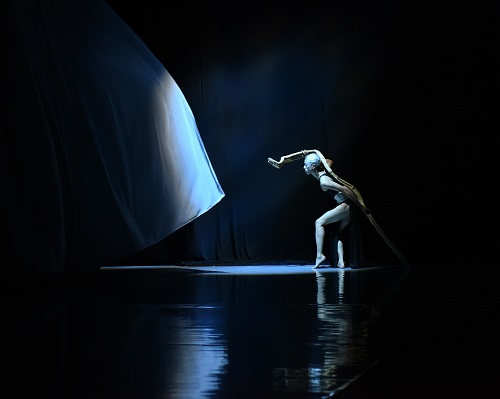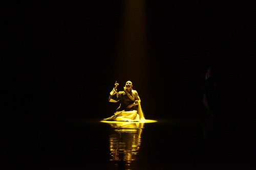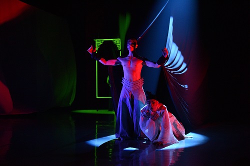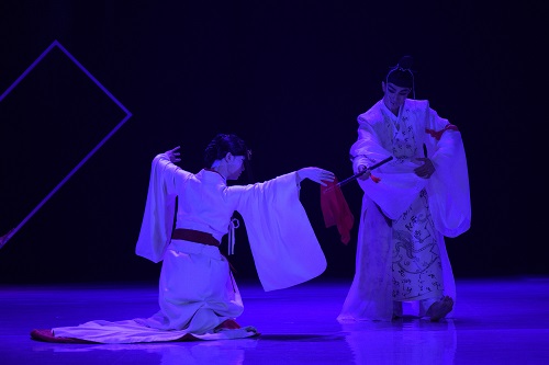 最初上场的是象征魔的舞者,他的舞姿妖娆而阴柔,但透过他却能看到舞台后面幕布中若隐若现的白衣女子,最是犹抱琵琶半遮面的动人心弦,让人不由地想去窥探女子的面容,单单是轻步点水地步伐就能感受出女人的娇媚。开场就能感受出一种独特的东方美——含蓄。而含蓄却也最是传神又传情的,尤其是表现男女主角的感情纠葛的时候。在这一点上,最有说服力的是舞台上的二人至始至终都没有过直接的肢体接触,女人的红丝巾,男人的笛子就婉转地表现了出来。从用笛子撩拨丝巾到二人交换信物,再到女人用唇含下系在笛子上的丝巾,一个个动作是层次递进的。这样的含蓄远远比直接来得让人欲罢不能。