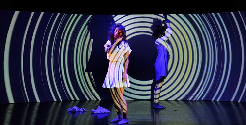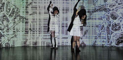 黑暗中,开始四处响起“叮”“叮”“叮”的声音,环绕在耳边,仿佛在准备着什么。三个身穿黑衣手拿小号的男子从舞台两侧走了上来,屏幕开始出现马路上人来车往的影像。周围开始吵闹烦杂,汽车鸣笛声伴随着画面一声声的跳动着,有着节奏感却又隐隐让人不安心烦。看似热闹却空洞的背景下开始出现雨声,氛围开始转变为静谧,两个白衣女青年出现在了舞台上,开始舞动颤抖重复……各种手机通话声让人觉得心烦意乱,让人想逃离却又无处可逃。 “不知道……”是我在如此乱的声音里唯一听清重复又重复的语言。渐渐地,声音越来越密集,音乐也越来越快,画面转动播放的速度让我不知所措……终于在一声巨响中全场暗了下来,我呼了口气。