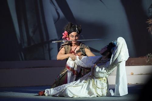 在布景上,舞台仅是一方竹林,两处岩石,配合幕布投影,营造旧时静谧的山丛林间,以及打出血红的标题罗生门三个大字。舞台右侧则掩藏着伴乐团队,时刻随唱腔托衬。两侧皆有字幕板,中文之下分别配置英文和日语,照顾了多国观众。内容为一桩竹林曝尸悬案,故事化繁为简,将情节三段式,矛盾主要集中在三位年轻主演之上,节奏更加紧凑,使观者作为县官寻求真相的代入感更为强烈。