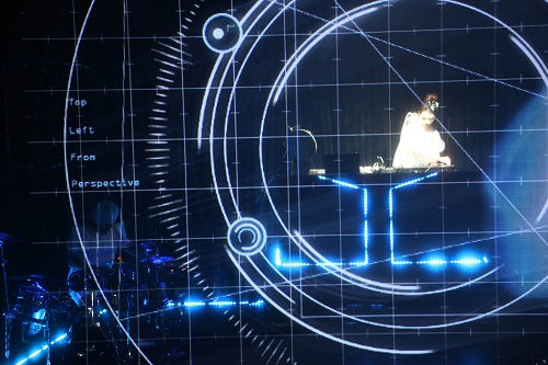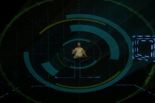 整场演出的激光投影令人目不暇接,一个一个显示器上变化跳动的蓝色数据,像是大数据时代下的数据流不断可视化的过程,而机台内的人就像机器人一样目无表情的操作,甚至是略带迟疑。当开场一系列快速变化的讯息流之后,现代社会的车流、人流、人们残缺的表情碎片般的在眼前掠过。由于激光是从观众席的后方射入,形成一条条的射线,使台上的一切都有种被远程控制的被动感,也就是说,整个游戏看似是玩家在操控,实际则是游戏的发明者在操纵。不论是游戏中的人物还是玩游戏的人都像提线木偶一般。在演出的最后屏幕中的一个一个人的模型纷纷从电脑机台种逃离出来,但是在屏幕的尽头,没有投影的区域那些人形毫无悬念的消失,将电子游戏的虚幻、不真实,与现实之间无法穿越的鸿沟完全呈现。