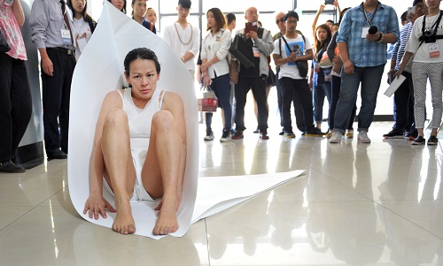 下午两点,红楼一楼大厅里。没有震耳欲聋的音乐,只见人群中两名身套白纸的白衣舞者在蜷曲扭动着,似要挣脱身上无形的枷锁。缓缓地,白纸在挣扎中被取下,两名舞者开始以各种扭曲的鬼面示人。再依靠夸张的肢体,借助墙、地面等穿上一袭鲜红的衣。