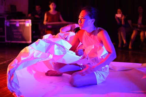 灯光,一半蓝一半黄,骤变,一半绿一半蓝,两名舞者焦急地褶皱起白纸盖在身上。