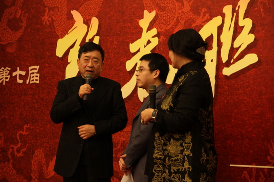 图为余秋雨教授发表讲话,萨日娜、阿丘担任主持