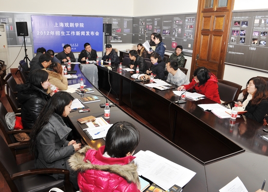 上海戏剧学院2012招生工作新闻发布会今天上午在佛西楼会议室举行。副院长黄昌勇、宣传部部长张生泉、招办主任陈其毅、表演系主任龙俊杰,以及新华社、上海电视台、光明日报、文汇报、新民晚报等20多家媒体代表出席了发布会。会议由宣传部部长张生泉主持。