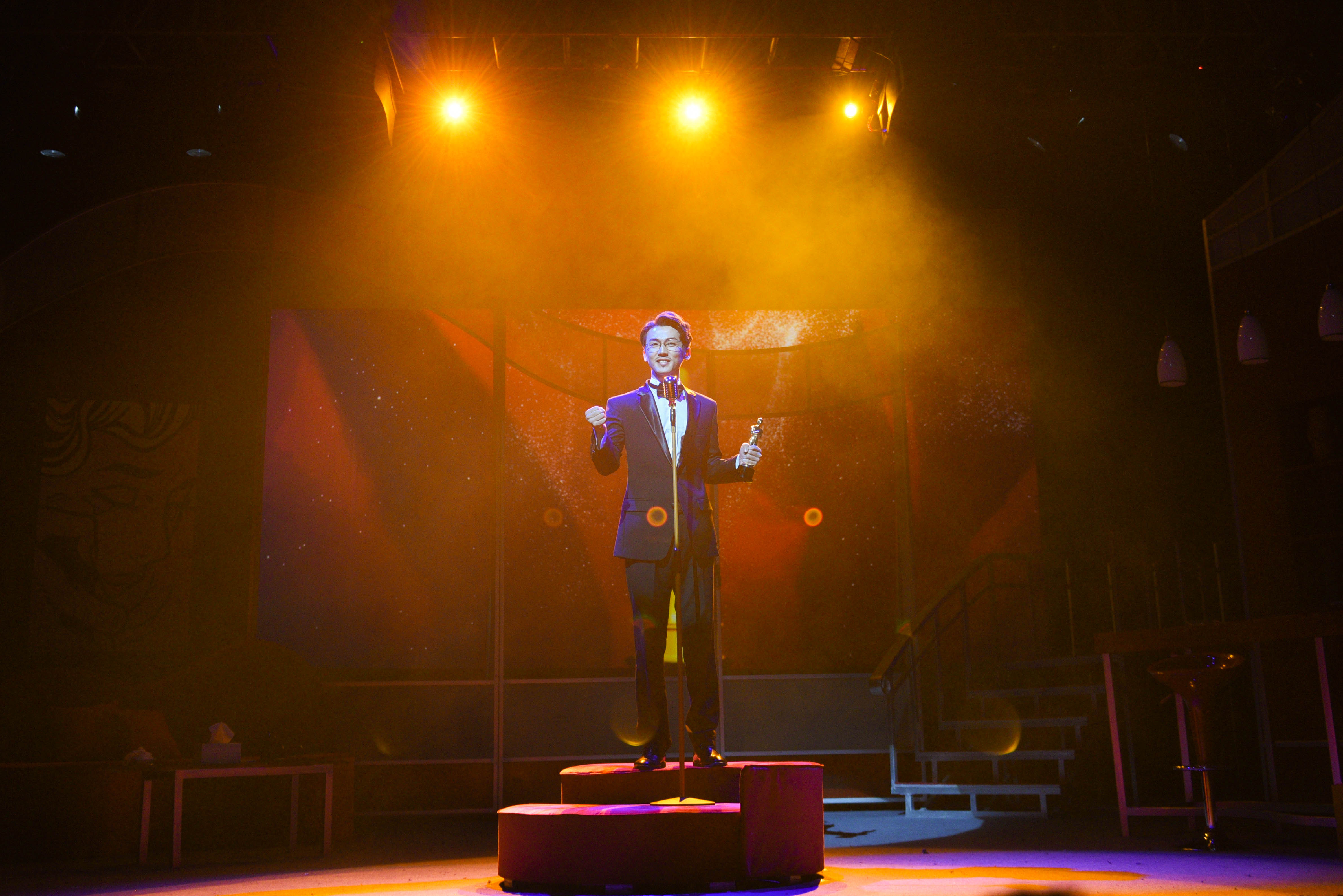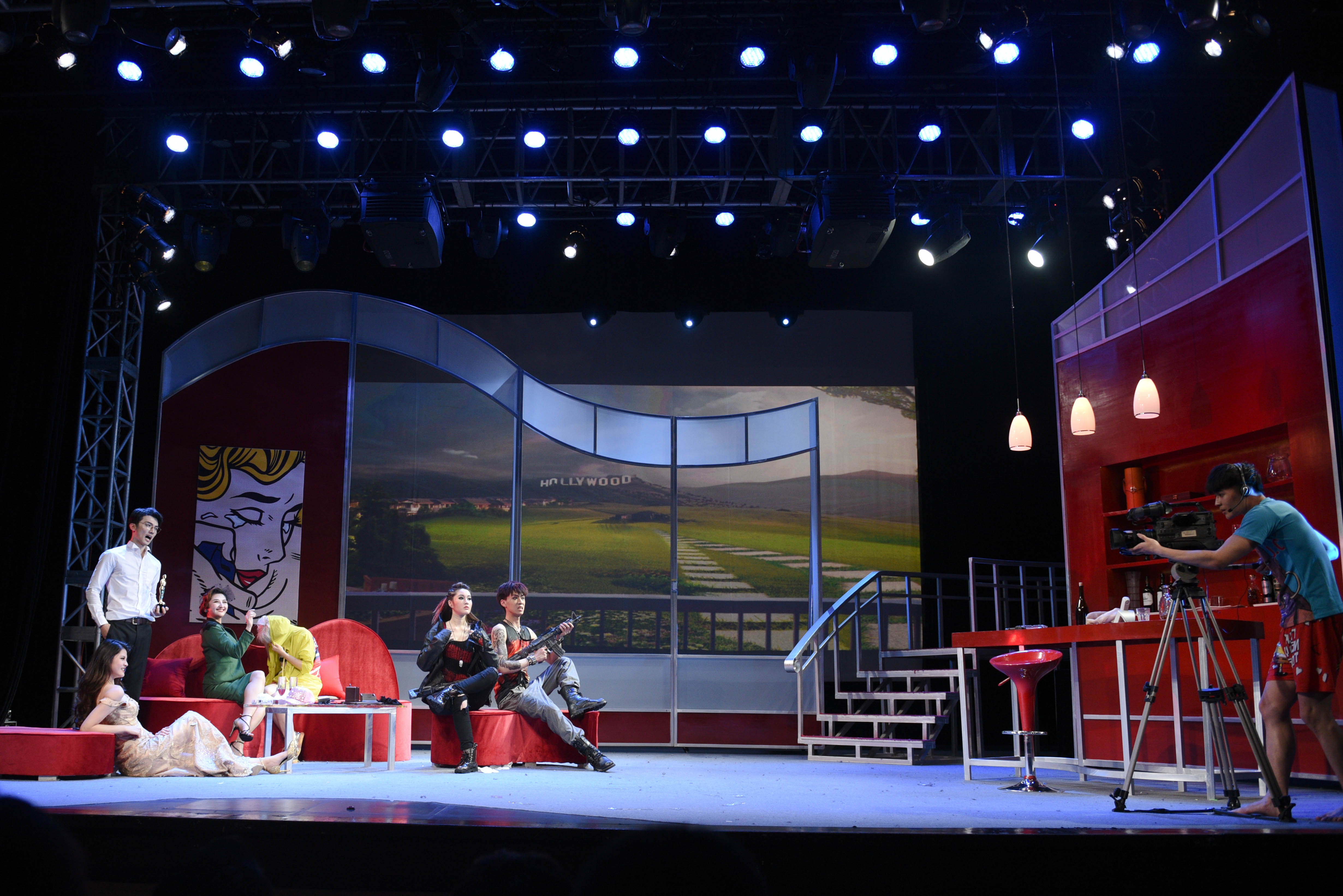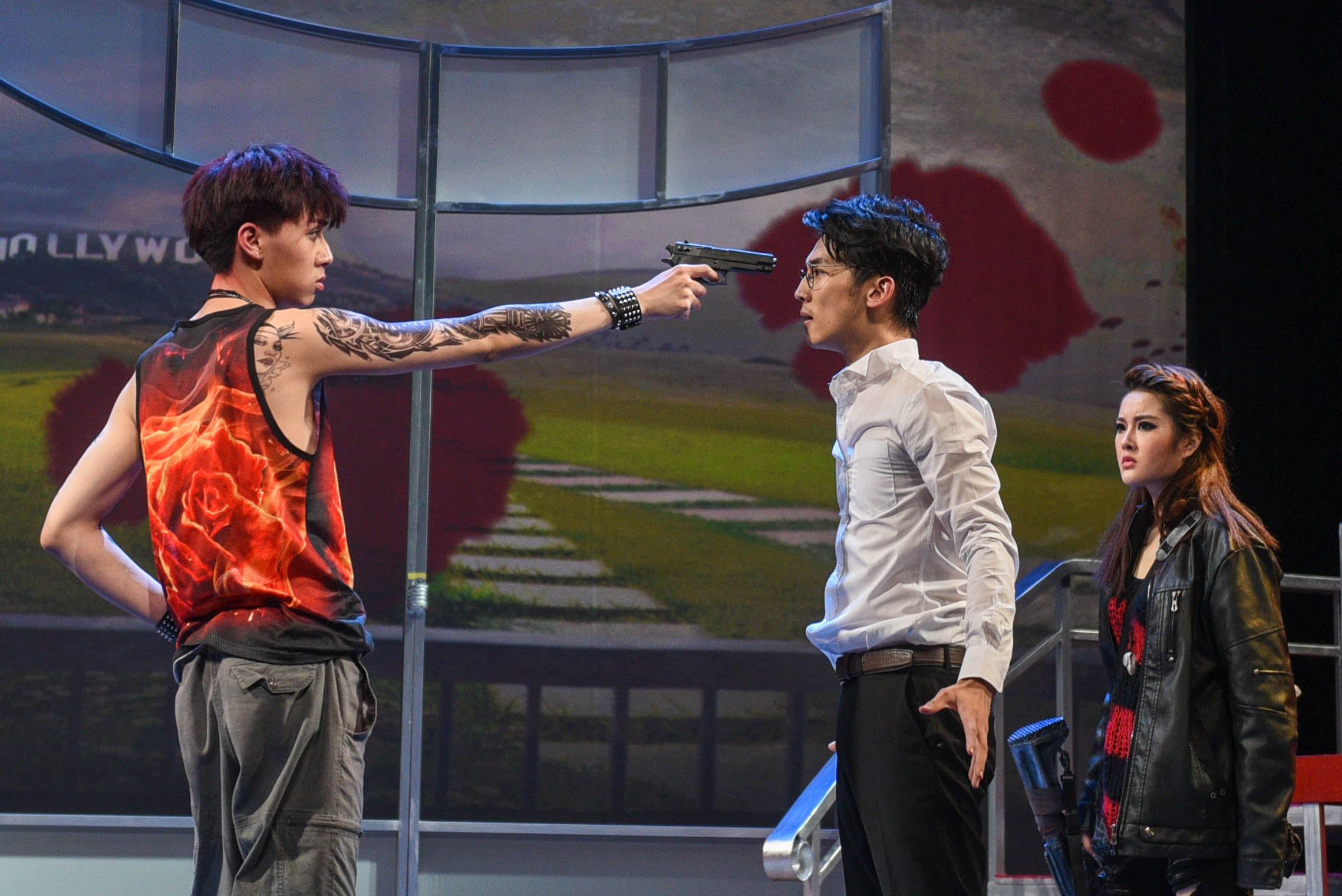 在舞台呈现方面,本剧也是可圈可点。舞台前后纵深、地势高低皆拿捏得当,道具、布景上都是典型的写实主义风格。值得一提的是,舞台天幕的多媒体运用十分出彩,时而与剧情合为一体,时而抽离出去展现另一番画面,给人以放大的戏剧效果。再配合上震聋怖人的枪声——“嘭”和快慢不定的收视率反馈声——“嘀”,不知不觉中就给观众营造出一种紧张的幻觉气氛。最后那一束束印染整个舞台的红色灯光,将整部戏推向了最高潮。