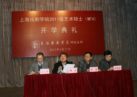 随后,韩生院长在开学典礼上做了讲话。韩院长首先介绍了此次在职MFA的招生情况,接着对新生们提出寄语。韩院长说,上海戏剧学院是全国唯一一所国家级综合艺术学院,五十名2011级MFA来自不同高校不同工作岗位,报考十个艺术相关专业,学生中人才济济,学科专业互补优势明显。作为一流高等艺术院校的硕士生,我们要身怀责任感、使命感,不仅重理论、勤实践,更要时刻把提高自身综合素质、追求艺术品质和崇尚艺术家道德放在紧要位置。韩生院长以艺术转型建设为背景,向新生们提出自我追问、自我要求、自我建构三点要求,并祝大家学习顺利、生活愉快,希望在上戏的未来两年时光成为新生们人生道路上的重要经历。