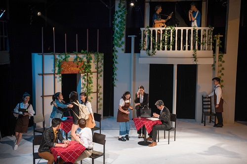 说到置身其中,舞美也是其中关键的一环。舞台美术做成了两层楼的模式。开场的时候像极了17世纪的意大利街头咖啡馆,和画中的十分相似。之后换景,二层楼的西尔维娅的阳台也对推动剧情的发展起到巨大的作用。