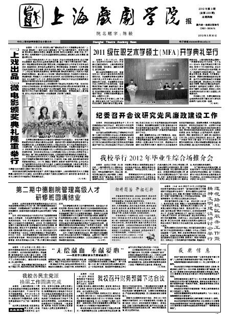 《上海戏剧学院报》2012年第3期(总第233期)已于2012年3月30日出版,本期共四版,重点内容有:《“上戏出品”微电影颁奖典礼隆重举行》、《2011级在职艺术硕士(MFA)开学典礼举行》、《纪委召开会议研究党风廉政建设工作》、《我校举行2012年毕业生综合场推介会》等,敬请关注。也可点击下载观看。(图文、编辑:榕树)