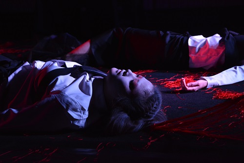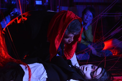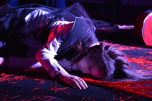 走进教室,红色的垂帘便印入眼帘。满地的红线缠绕交织在一起,象征着红色的欲望的网。演员们在黑色的地毯上匍匐、爬行、寻找、拾起又放下地上散落缠绕在一起的红线。用肢体,用全身上下的每一个关节表达自己的情感。那红色的欲网,每一个置身于其中的人都无法脱离,挣扎只能是无用的,而最后的结局也必然是被欲望、被自己吞噬。