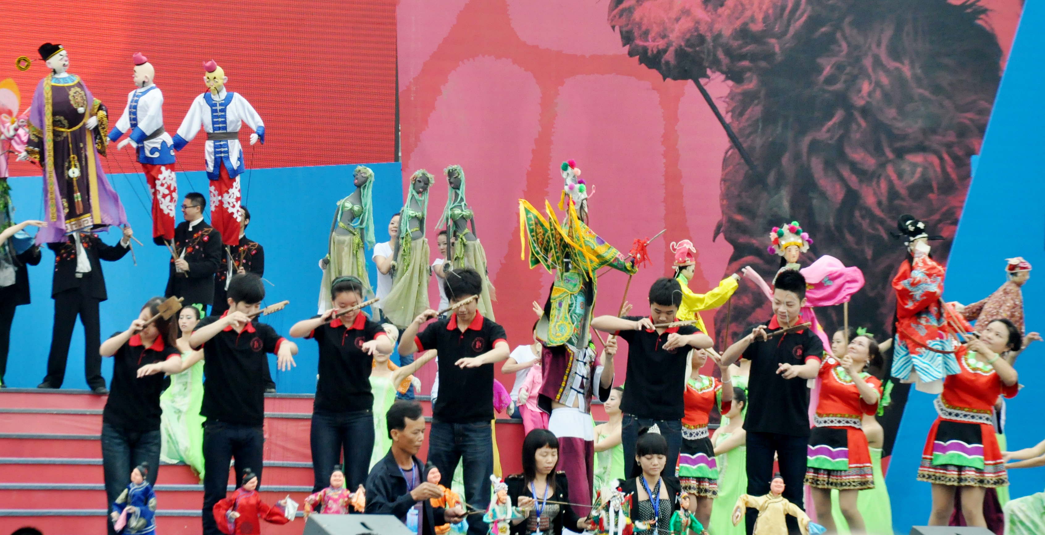 5月27日,第21届国际木偶联会大会暨国际木偶节开幕式在成都非遗博览园隆重上演,拉开了本届国际木偶节精彩序幕。开幕式文艺演出以“五洲偶戏荟中华”为主题,以展示木偶、皮影艺术为主要内容,分为“宾至花烂漫”、“袖舞蝶韵情”、“异域风采秀”、“影动映春秋”和“千偶竞风流”五个篇章,舞台表演采用是人偶同台的方式,上台的演员有1100余人,精彩纷呈,完美展示各国和各地区木偶艺术的特点。整场演出强化人偶与观众的交流互动,有些国外的演员还站在巡游花车上,展现自己的独门绝技,为观众带来了一场木偶嘉年华盛宴。