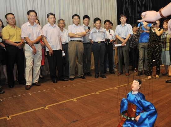 图为委员们观看戏曲学院提线木偶展示