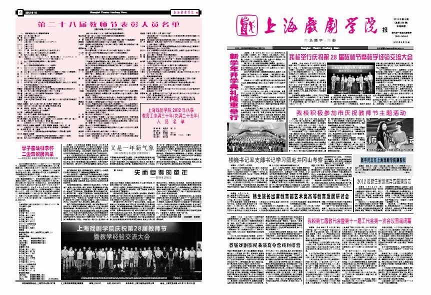 《上海戏剧学院报》2012年第8期(总第238期)已于2012年9月10日出版,本期共四版,第一、四版套红。重点内容有:《新学年开学典礼隆重举行》、《我校举行庆祝第28届教师节暨教学经验交流大会》、《我校积极参加市庆祝教师节主题活动》、《郭宇同志任上海戏剧学院副院长》等,敬请关注。也可点击下载观看。(文、图、编辑:榕树)