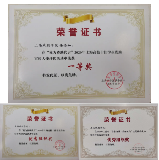 舞蹈学院学生徐添如在2020年上海高校十佳学生资助宣传大使评选活动中获得了一等奖,上戏获得“优秀组织奖”。