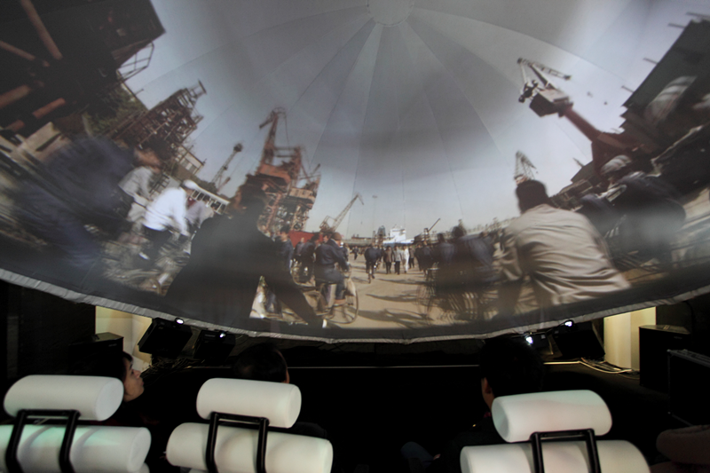 在我校参展的米亚(全称“媒体视觉综合艺术”)剧场前,观众排起了长龙,争相进去体验540度的球幕空间。米亚的舞台全方位空间处理技术包括数字灯光、数字立体音响、4D环境模拟、总控技术、多媒体影像、虚拟交互等数字技术,它带给观众的沉浸体验式全覆盖是其他技术无法比拟的。