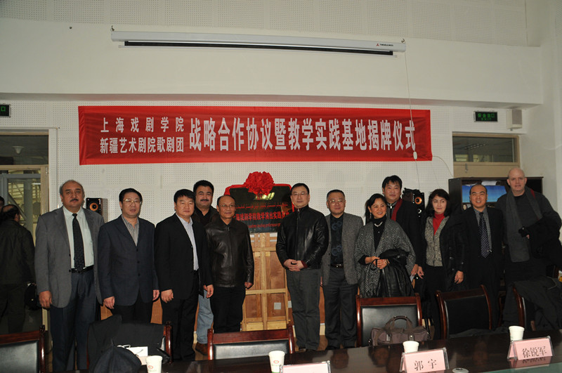 上海戏剧学院副院长郭宇与新疆歌剧团团长吐尔洪·依明代表双方签订合作协议。文化厅党组成员、纪检组组长徐良同志与上海戏剧学院副院长郭宇同志为“上海戏剧学院教学演出实践基地”揭牌。