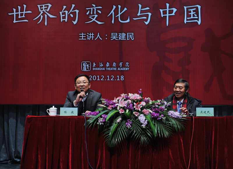 吴大使围绕世界金融危机中心、世界动荡中心和全球经济增长中心这三个“中心”的转移,全面阐述了2012年世界形势的新变化和新特点,强调在当前复杂多变的国际形势下要保持清醒的头脑,坚持改革开放和发展的国策不动摇。吴建民强调,十八大报告鲜明地提出“扩大同各方利益汇合点”,这是当前国际关系的新思路。在提问互动环节,吴大使还就民生问题、主流文化、国际争端等老师们感兴趣的问题做了详尽的解答。