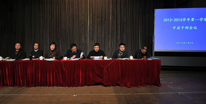 2013年1月10日下午,我校在新空间剧场举行中层干部会议。党委书记楼巍主持会议,院长韩生传达了文化部工作会议精神并部署2013年工作,胡敏、黄昌勇、宫保荣、张伟令、郭宇等领导出席会议并就各自分管的工作做了讲话。