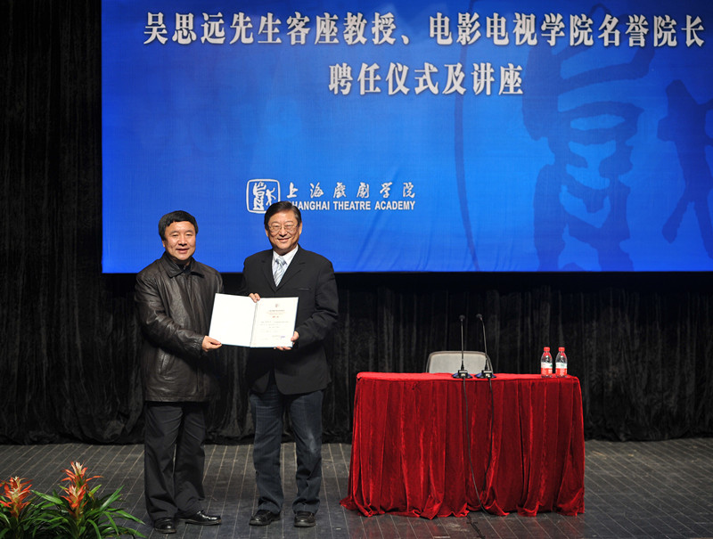 3月14日下午3点,吴思远先生客座教授、电影电视学院名誉院长聘任仪式及讲座在端钧剧场举行。党委书记楼巍、院长韩生、副院长黄昌勇、党委宣传部长张生泉、人事处处长张�、教务处处长厉震林、电影电视学院院长胡雪桦及影视学院师生出席。聘任仪式由黄昌勇副院长主持,胡雪桦教授介绍吴思远先生简况后,楼巍书记宣读《上海戏剧学院关于聘任吴思远先生为电影电视学院名誉院长的决定》,韩生院长为吴思远先生颁发聘书并佩戴校徽。