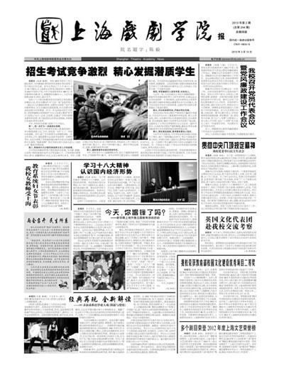 《上海戏剧学院报》2013年第2期(总第244期)已于2013年3月10日出版,本期共四版。重点内容有:《招生考试竞争激烈 精心发掘潜质学生》、《我校召开党员代表会议暨党风廉政建设工作会议》等,第三版还选登了赖声川在“冬季学院”讲座的内容,敬请关注,也可点击下载观看。(文、图、编辑:榕树)