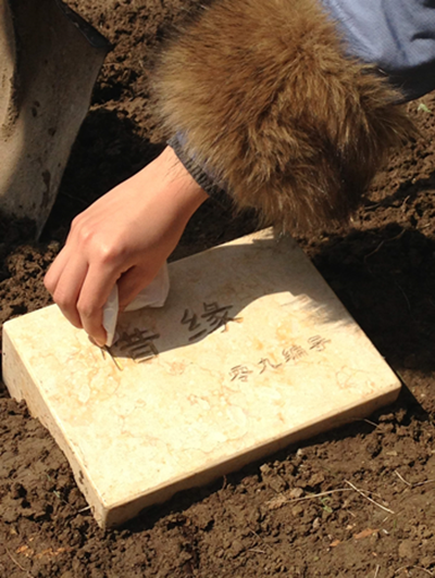 11点30分,植树仪式正式启动。09编导的男生们悉数出动,齐心协力将这棵3米高的玉兰树扛到了校区正门喷水池边的草坪上,放进事先挖好的树坑里。班主任张小鸥老师为新树填了第一铲土,之后同学们依次为这棵树填土、浇水,忙得不亦乐乎。玉兰树边同学们还竖起了一块大理石标牌,上刻“惜缘 零九编导”的字样,铭记着同学们在上戏这四年最美好的青春记忆,纪念那些属于27个人的幸福时光以及对母校依依惜别的深情。