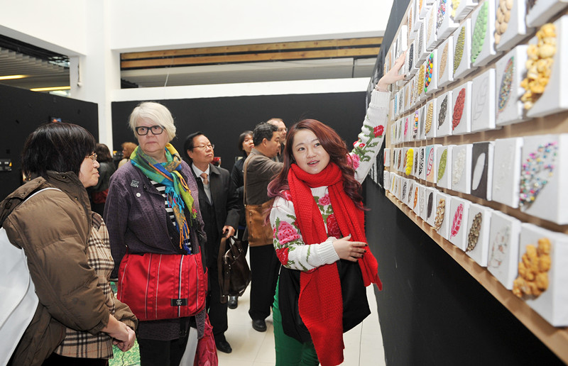 图为我校学生向嘉宾介绍作品