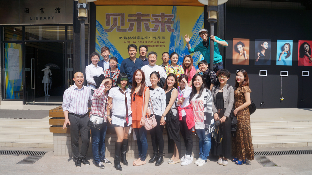 图为09媒体创意班级同学与领导和老师合影