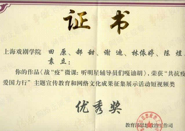 我校制作的《战“疫”微课:听明星辅导员噶讪胡》,近期荣获了教育部思想政治工作司颁发的“‘共抗疫情、爱国力行’主题宣传教育和网络文化成果征集展示活动”短视频类优秀奖。