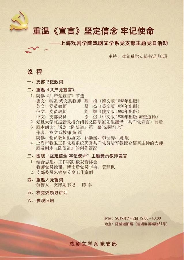 在党建和专业双推进的过程中,采取支部建在学科、支部建在团队、支部建在项目中的做法,探索推行“支部+学科”“支部+团队”“支部+项目”等模式。比如在国家艺术基金人才培养项目“百·千·万字剧”编剧工作坊中,组建临时党支部,开展组织生活,加强党对临时机构的靠前领导。此外,还结合专业特色创新组织生活形式。戏文系党支部在陈望道旧居开展主题为“重温宣言,坚定信念,牢记使命”的党日活动,以剧本朗读的形式,演出了戏文系教师创作的话剧《陈望道》第一幕“柴屋灯光”,举办《红色题材的艺术表达》讲座等,使基层党建生动活泼有内涵。