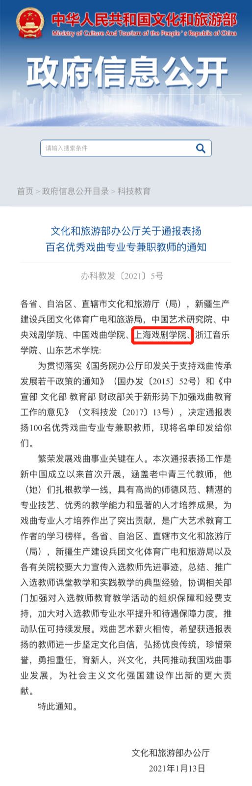 《文化和旅游部办公厅关于通报表扬百名优秀戏曲专业专兼职教师的通知》,于近日发布。