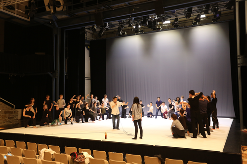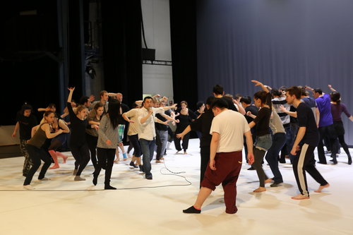在结束演出的第二天,我们上戏团队便投入了戏剧节第二个单元———国际版《罗密欧与朱丽叶》的排练工作中。国际版的演出由主办方将剧本划分成十三个小段落,并将其分配给来自五个国家的五位导演,由他们在限定时间内带领参加此次戏剧节的52名演员进行排练。卢昂教授被分配到家族械斗、罗密欧蒙丘西欧与提博尔特的打斗以及曼多亚三个参与演员最多排演难度最大的片段。主办方要求这三个片段所有52名演员均要参与演出并且其中各角色由来自五个国家不同的演员共同饰演,而排练的时间就在分配会议结束后的一小时。当卢昂导演提出争取在两小时以内完成三个片段的初次创作任务以便其他四位导演在第二天能够有充足的时间排练时,主办方及在场其他导演纷纷表示这是一项“不可能完成的任务”。而这一次,“神秘的中国团队”再一次让大家惊叹。在两个小时的排练中,卢昂教授不仅顺利带领52位来自不同国家说着不同语言的演员完成了三个宏大场面的创作排练,还与现场音乐创作即时沟通确定了演出当天的配乐。此外,在国际版演出为期仅仅两天的紧张排练中,由我院导演系青年教师率领的导演系、表演系学生演员团队与来自其他各国的导演与演员积极配合、共同创作,体现出了极高的专业素养,得到了大家的肯定与赞扬。在4月19日国际版《罗密欧与朱丽亚》的演出中 ,52名演员集体亮相, 此刻福克旺艺术大学的新剧场仿佛一个巨大的戏剧嘉年华,不同的语言吟咏着同一句莎翁经典台词,不同的表演风格共同演绎着同一个戏剧情境,不同的民族文化在此刻碰撞出火花,现场观众被舞台上演员们的青春活力与激情所感染,与他们共同享受着这一出不同寻常的《罗密欧与朱丽叶》。
