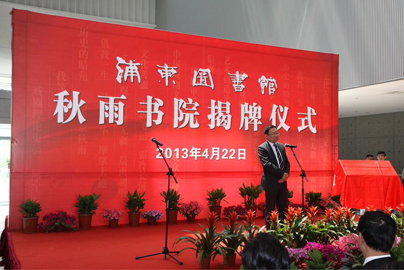在“世界读书日”到来之前,“秋雨书院”上海分院4月22日 在浦东新区图书馆举行揭牌仪式。我校教授、国际著名学者、作家余秋雨 ,原上海市人大常委会副主任胡炜,我校党委书记楼巍、院长韩生,中共浦东新区区委常委、宣传部部长邓捷,以及我校马兰、厉震林 教授出席揭牌仪式。