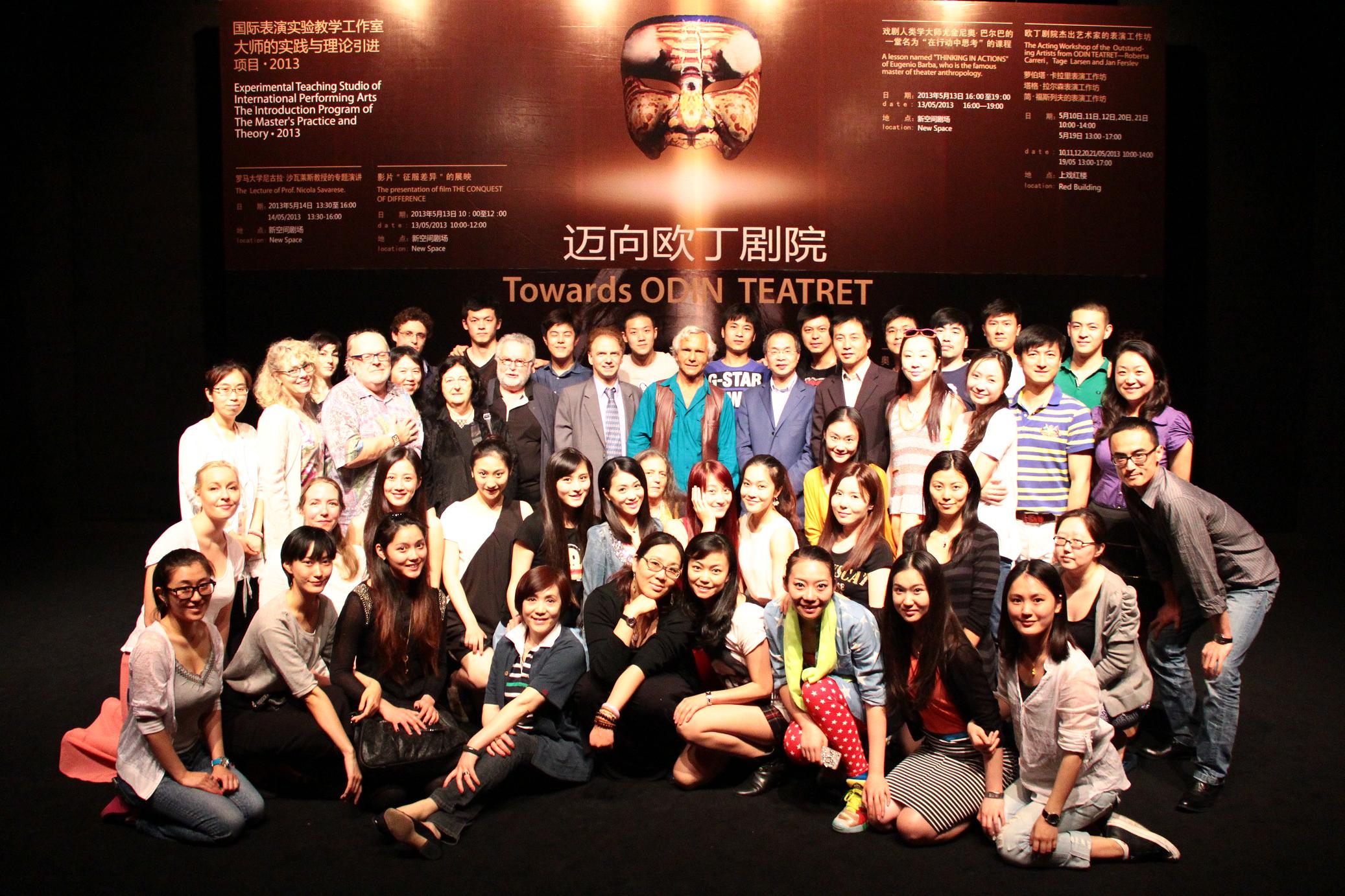 正值阳光明媚的春末夏初时节,上海戏剧学院的校园格外迷人。就在这个美丽的五月,国际表演实验教学工作室大师实践与理论2013年引进项目“迈向欧丁剧院”正在火热进行,有幸请来了欧丁剧院的创立者、戏剧大师尤金尼奥·巴尔巴先生和欧丁剧院杰出的演员萝伯塔·卡拉里、简·福斯列夫、塔格·拉尔森、朱丽亚·瓦尔莱、伊莲娜•福罗瑞斯和皮兰吉罗·庞巴,以及跟随欧丁剧院多年的罗马大学的剧场人类学专家尼古拉·沙瓦莱斯教授前来授课。