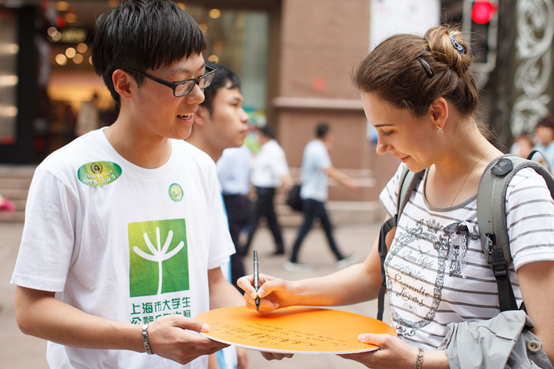 此外,在舞美系辅导员江玲君的精心安排下,我校还组成了一支公益践行队伍,现场与市民互动,传播作品理念。同学们深入到步行街的各个角度,向老人、儿童、白领、外籍人士纷纷宣传环保理念,传递正能量,展现上戏风采,成为了步行街一道亮丽的风景线。(文:盈之 图:学生记者 任海华 编辑:榕树)