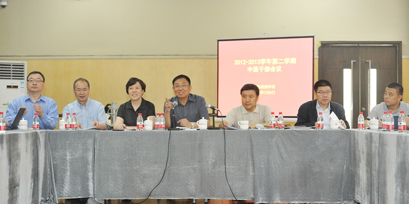 7月6日上午,2012-2013学年第二学期中层干部会在1号形体房召开,校领导楼巍、韩生、胡敏、黄昌勇、宫宝荣、张伟令、郭宇和全体中层干部出席会议。