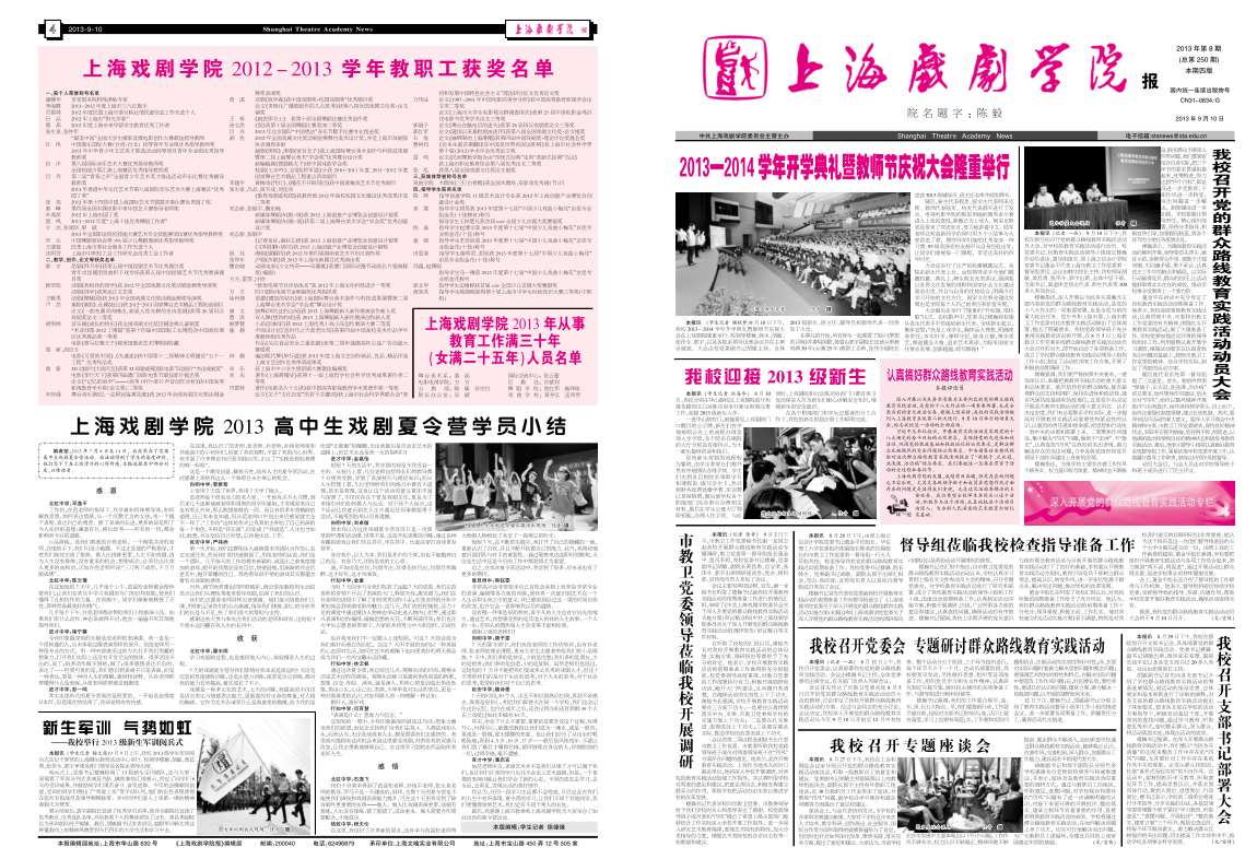 《上海戏剧学院报》2013年第8期(总第250期)已于2013年9月10日出版,本期套红,共四版。重点内容有:《2013-2014学年开学典礼暨教师节庆祝大会隆重举行》、《我校迎接2013级新生》、《我校召开党的群众路线教育实践活动动员大会》、《市教卫党委领导莅临我校开展调研》等,本期第三版还刊登了党委书记楼巍同志和督导组组长董金平同志在我校党的群众路线教育实践活动动员大会上的讲话,敬请关注,也可点击下载观看。(文、图、编辑:榕树)