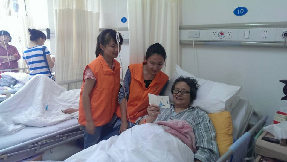 10月13日重阳节当天,创意学院团总支16名志愿者再次来到华东医院,在华东医院社工部宫老师和志愿者陈大姐的带领下,先后来到肿瘤科、心血管科、肾内科和神经内科四个病区的各个病房探访。在病房内,学生志愿者为老人们送上了自己亲手制作的贺卡并对老人们送上了重阳节的真切问候。在探访中,有的志愿者同学坐在床边为老人们朗诵贺卡上的动人诗句,真挚的情感打动着在场的每一个人。还有的同学上前握住老人们的手,同他们亲切聊天,祝福他们早日康复。同学们来到病房,受到了老人们和家属的热烈欢迎,他们对学生志愿者们征用休息时间来探望他们的爱心行为表达了感谢,有的老人当场泪洒病床,这一幕幕让人心疼和感动……活动结束后,同学们纷纷表示在此次活动中受益良多,并要带着感恩的心将爱心一直延续下去,为更多的人带去温暖,服务社会。我校创意学院团总支公益事业部也将会继续组织学生志愿者到华东医院对这些平日里缺少关怀的老人进行长期定点的探望和关怀,从陪伴聊天、按摩整理等实际小事做起,将爱心落到实处。
