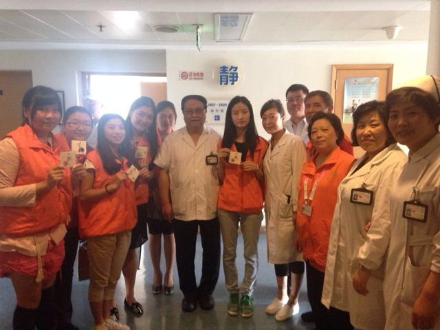图为首日活动我校志愿者与华东医院俞卓伟院长及其他医生、护士合影