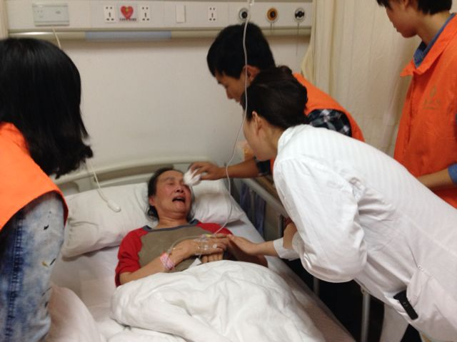 图为住院老人看到志愿者前来尊老助老激动得当场落泪